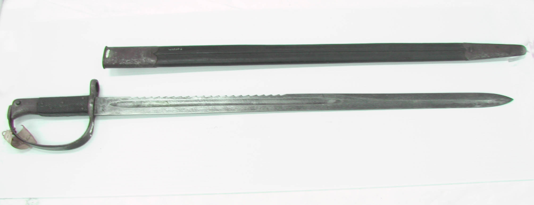 English: British Pattern sawback bayonet for Martini Henry artillery carbine markings- initials- on blade- VR; acceptance marks- 8-85, 8-86, -89, -94, 8-91 (-44); War Department marks- broad arrow and WD and sold out of service marks; view marks- (crown) - BR - 46' (crown) - 62 - E; crown - E - 63, and crown- E - 59; condemned marks; and initials WR; markings on hilt- I X BJA; view marks- (crown) - BR - 34 and (crown) - E - 59; markings on pommel- 12